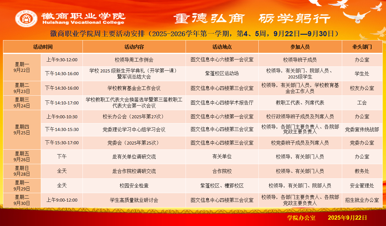 第4、5周主要活动安排(9月22日——9月30日)