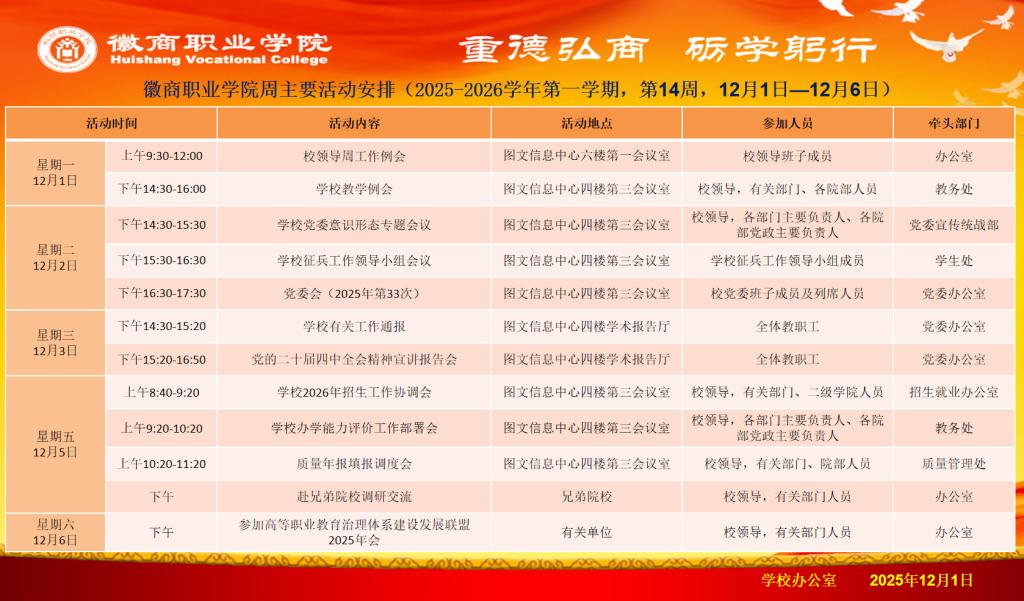 第14周主要活动安排(12月1日——12月6日)