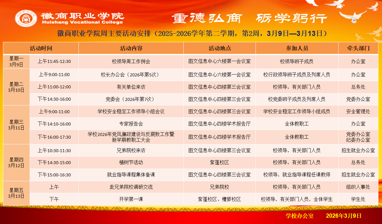 第2周主要活动安排(3月9日——3月13日)